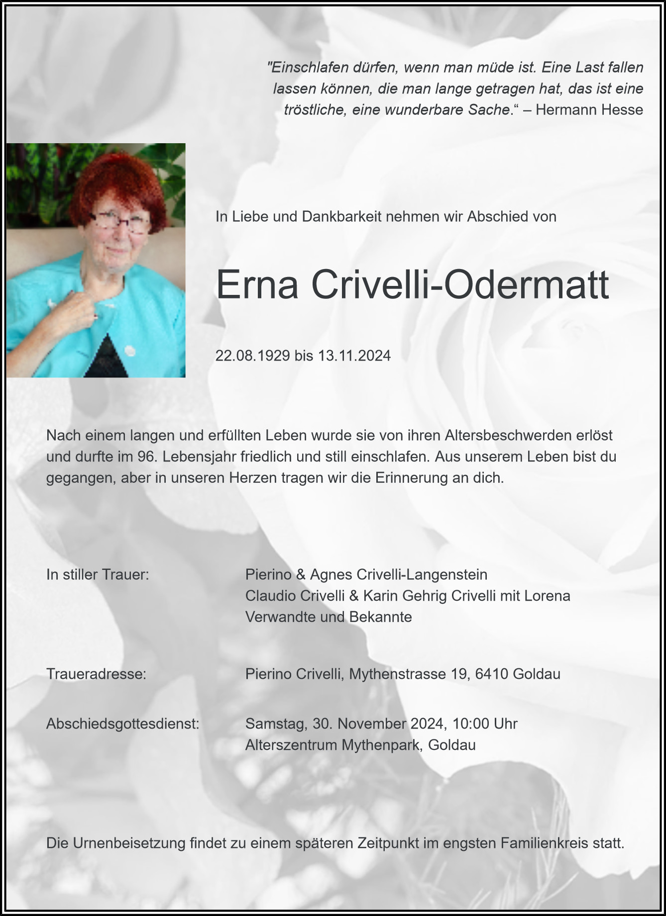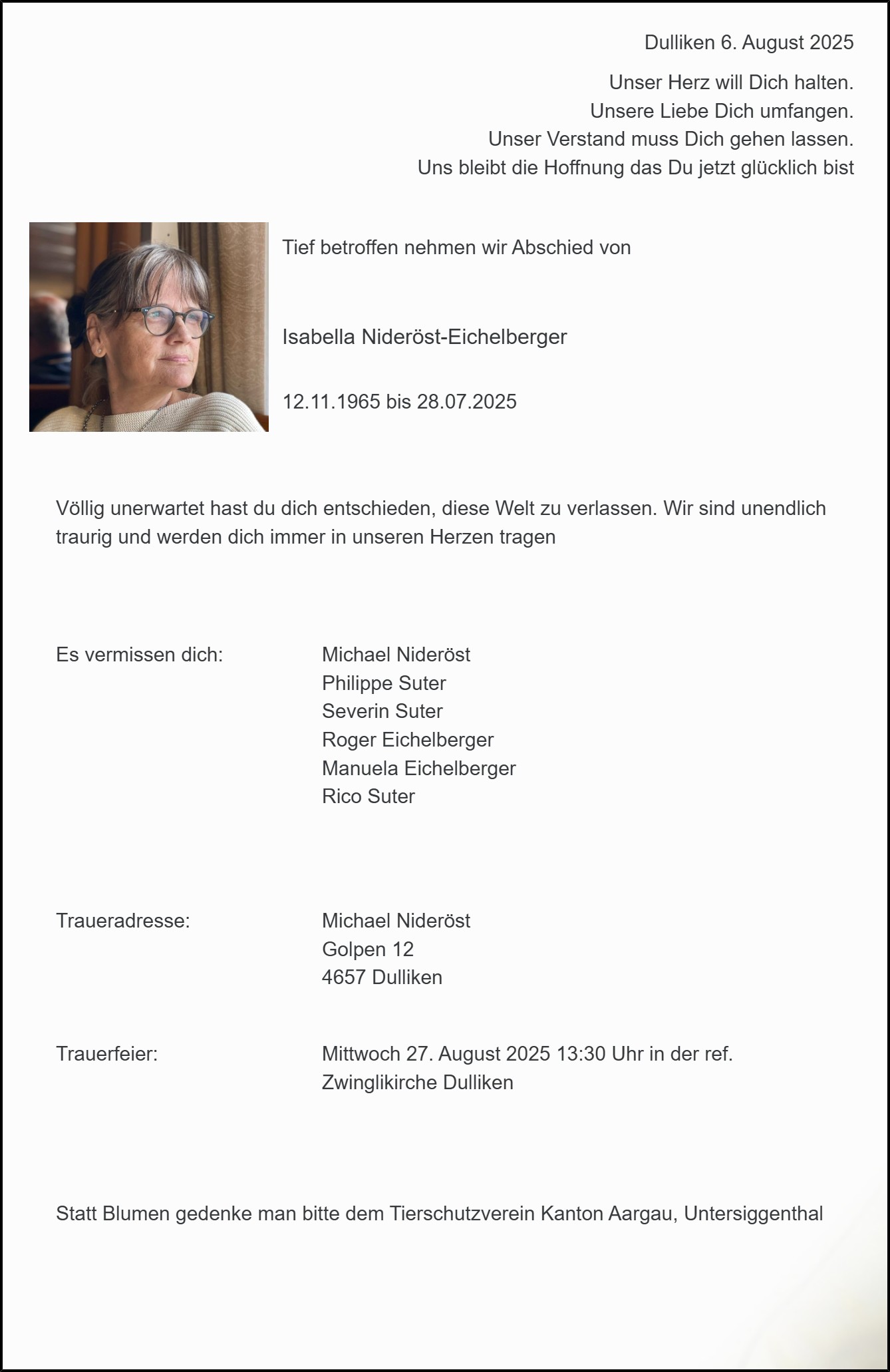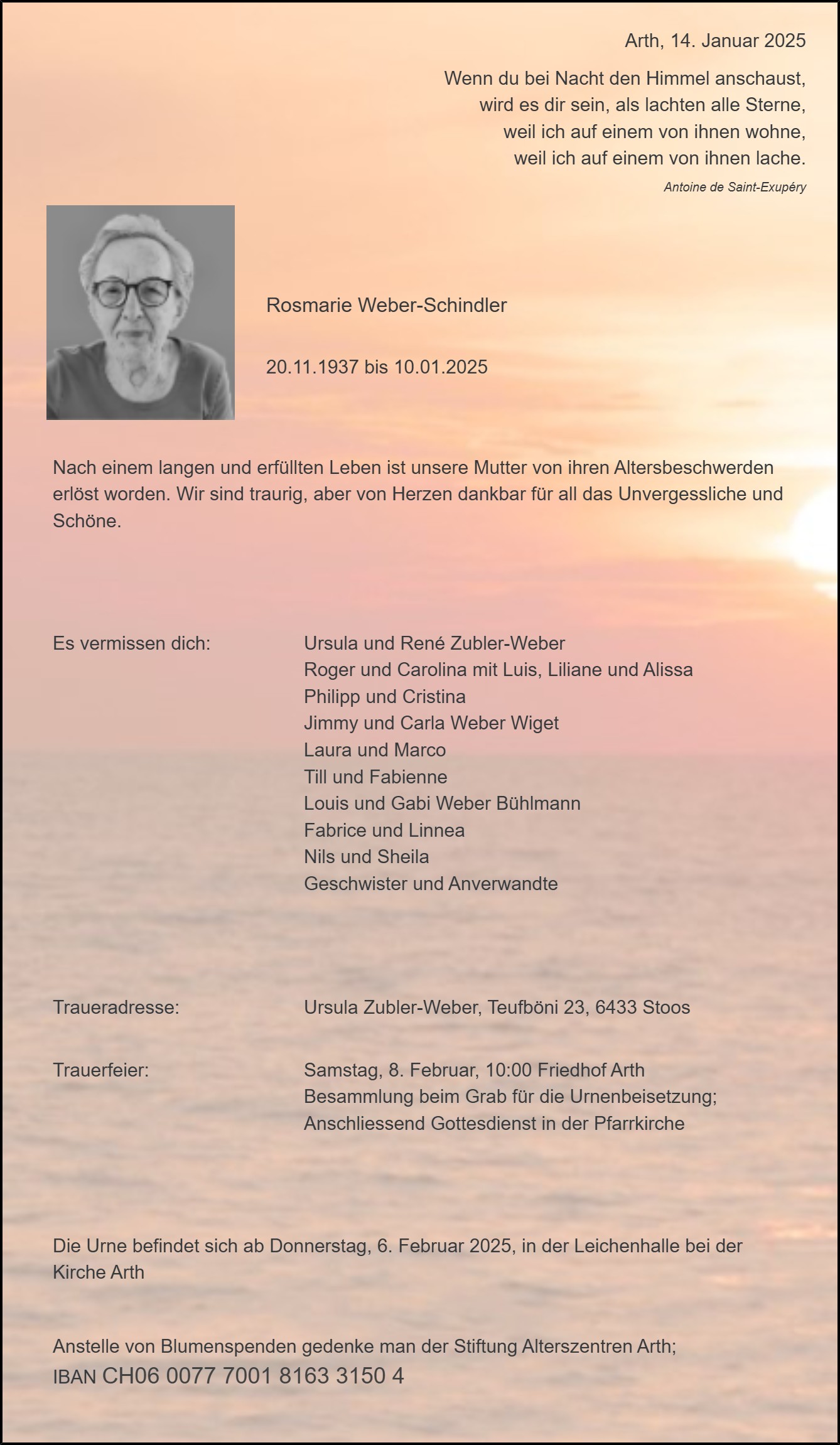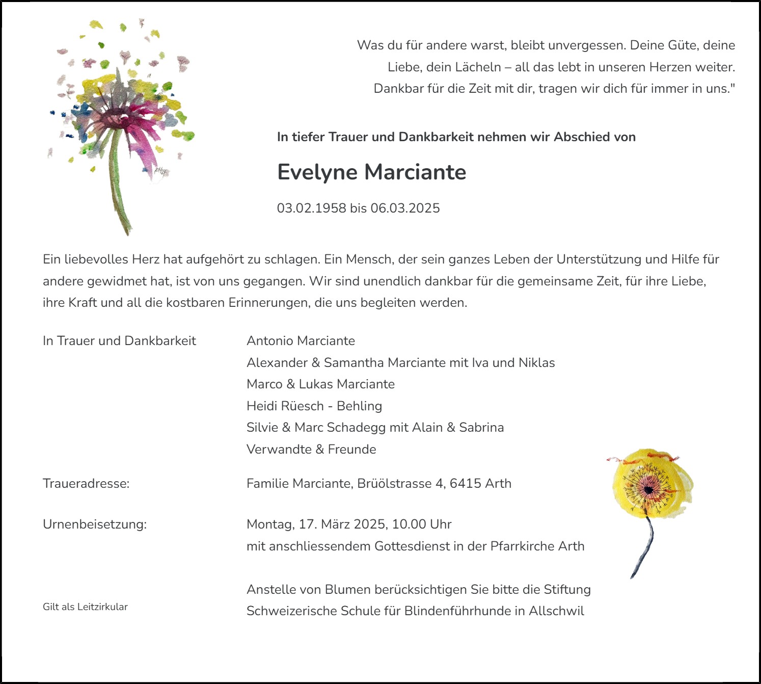 Eine Todesanzeige kostet einmalig CHF 289.00 inkl. MwSt. Unabhängig von Grösse, Farbe und Gestaltung. Immer günstiger als eine Zeitungsanzeige.